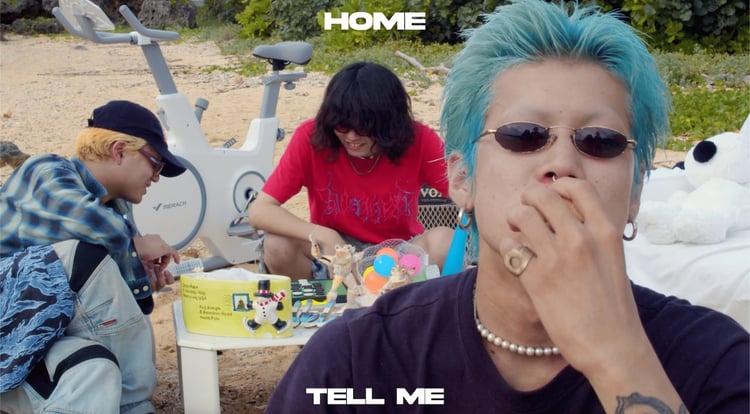 「Tell Me」は10月にリリースされた新作EP「HOME EP2」の収録曲。MVはコレクティブ・CHAVURLに所属するDJのeijinが監督を務め、ビジュアルアーティストのjvnpeyが照明および3DCGの制作、Suiがアートディレクション、auskouがスタイリングを担当した。撮影はHOMEの地元である沖縄で実施。浜辺でトイピアノをいじる3人、便座に座りながら歌うseigetsu(Vo)、風船を引っ張り合うo-png(PC) とshun(G)など、メンバーの和やかな姿を前面に押し出した作品に仕上がっている。