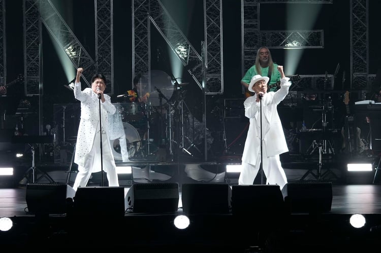 さらに終盤のサビに入るタイミングでステージから客席に金テープが発射され、まだ始まったばかりにもかかわらず、ライブは早くもクライマックスのような雰囲気に。とんねるずの2人はファンとのひさびさの再会を喜ぶように客席に手を振りながら、そのまま舞台の両袖へと消えていった。