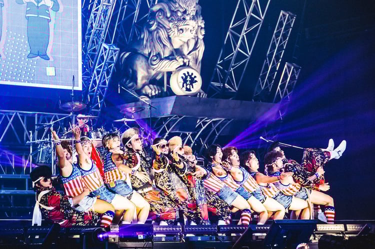 2日間にわたる「氣志團万博」、今年の大トリとして登場したオーガナイザーの氣志團。初日同様にオープニングナンバーの「俺達には土曜日しかない」からバックダンサーとしておなじみの微熱DANJIに加えて7ORDERが登場し、キレのあるダンスで会場を沸かせた。氣志團の故郷、そして万博発祥の地である房総への思いを捧げるように披露された「房総魂」では過去の万博の映像がバックに流れ、このイベントのルーツを改めて観客に示した。