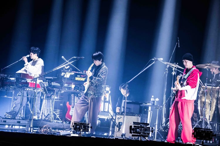 続いてアジカンの楽曲「ループ&ループ」のカバーが披露され、客席に喜びと驚きが広がる。この選曲をしたという金澤は「バンドが止まっているときにゴッチが誘ってくれて、70公演のツアーを一緒に回って。当時かなりの曲数を演奏したんですけど、その中でも楽しかった思い出が最も残っている曲です」と思いを語った。「今こうしてステージに立てているのは、2組のおかげと言っても過言ではない」と改めてゲストへの敬意を表した山内は、次に演奏する楽曲の選曲理由について「『出会ったことが全て』というメッセージが強烈に残っている」と説明。そしてくるりの楽曲「魔法のじゅうたん」のカバーによって、ホールがハートウォーミングな空気に包まれた。演奏後、加藤慎一(B)は「20年前、僕らがデビューした頃、ゲストの2組は……言い方がアレですけど、売れていた。そしてかけがえのない存在になり、こうやってライブができていること、本当に素晴らしいと思います」と胸の内を語った。