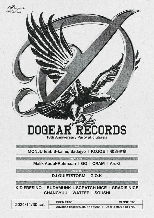 DOGEAR RECORDSのアニバーサリーパーティ「DOGEAR RECORDS 18th Anniversary Party at clubasia」が11月30日深夜に東京・clubasiaで開催される。
