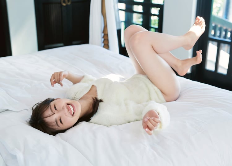 「陽射しのパレード」は“キラキラはっぴー”をテーマに、ベトナムのビーチリゾート・ダナンを中心に撮影が行われた写真集。先行カット第8弾はゆったりとしたニット姿の佐々木がベッドでくつろぐ様子を収めた写真で、休日のリラックスした朝を思わせる自然体な1枚となっている。