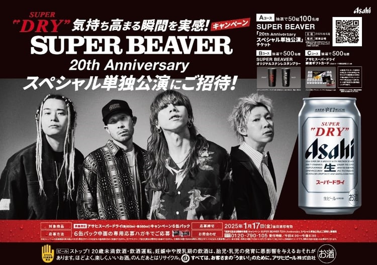 「アサヒスーパードライ」購入者を対象としたキャンペーンでは、6月に行われる「SUPER BEAVER 20th Anniversary スペシャル単独公演」に抽選で50組100名を招待。このほかオリジナルタンブラーなどの賞品も用意されている。応募方法などの詳細はキャンペーン公式サイトで確認を。
