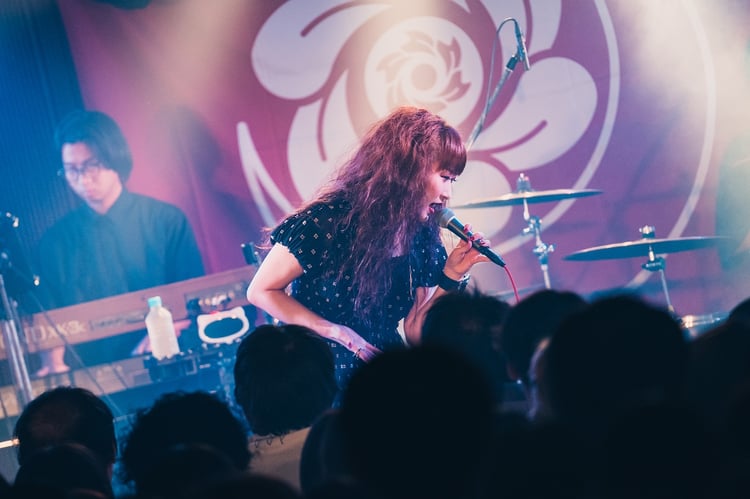 ライブは未発表曲「夕方」でスタート。山田康二郎(Dr)が刻むタイトなビートの上で、理姫(Vo)のざらついた歌声と石地翔汰(Key)のきらびやかなフレーズがこだまする。理姫は「あたしはね、なんでもすぐに飽きちゃうんだよ。だけどね、1つだけやめられないことがあります。それがバンドです! どうしていつまでもいつまでもライブに来てくれるんだよ。みんなおかしいんじゃない? あたしはね、幸せすぎて気が狂いそうだよ!」とシャウト。「8ミリフィルム」ではステージの照明が白く、こうこうと輝き、抑制された1曲目からのカタルシスが観客を魅了する。メロディックに動き回るバンビ(B)のベースが圧倒的なグルーヴを生み出し、理姫の切実な歌声がフロアを飛び交った。