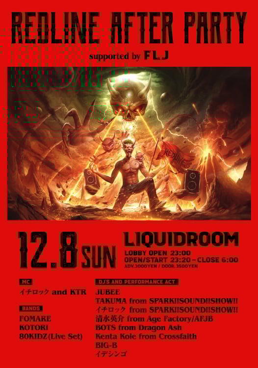 JMS主催のライブイベント「REDLINE ALL THE FINAL」のアフターパーティ「REDLINE AFTERPARTY」が12月8日に東京・LIQUIDROOMで行われる。
