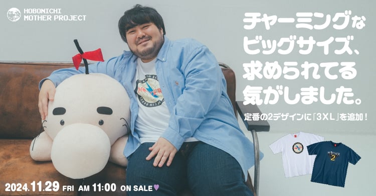 3XLを追加した2デザインのTシャツは、11月29日11:00よりオンラインストア「MOTHERのおみせ」と東京・TOBICHI東京で販売される。