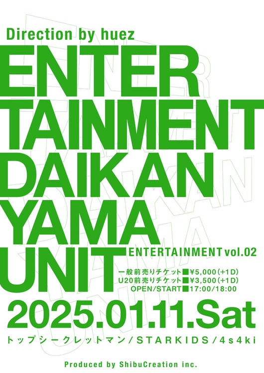 空間演出ユニット・huezが演出を手がける音楽イベント「ENTERTAINMENT」の第2回公演が2025年1月11日に東京・UNITで開催される。