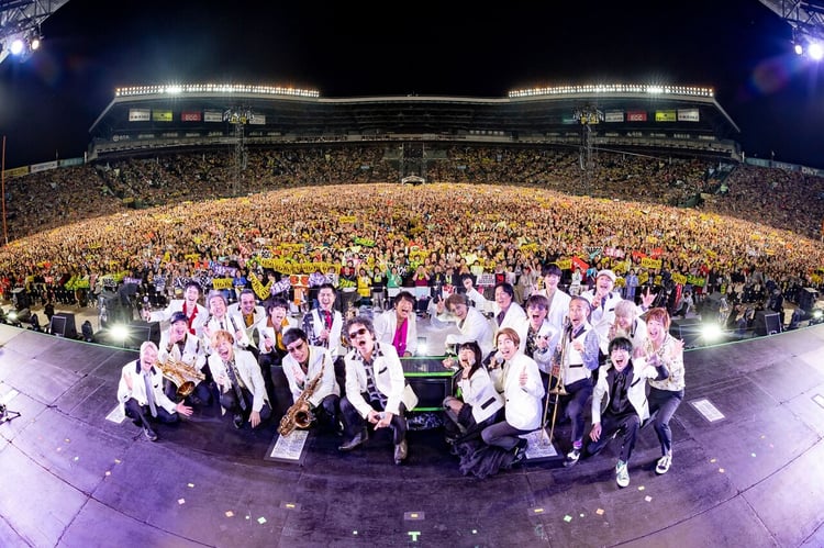 「東京スカパラダイスオーケストラ!」と川上が名乗りを上げ、9人は35年前にリリースされたデビュー曲「MONSTER ROCK」で「スカパラ甲子園」をスタートさせた。ステージセンターに飛び出した大森の熱いアジテートがさく裂したのも束の間、NARGOが勢いよく吹き鳴らしたトランペットから「火の玉ジャイヴ」へとなだれ込み、今度はGAMOが「ついにこの日がやってきたぜ! 最後まで思い切り楽しんでくれ!」と快哉を叫んで聴衆の熱狂をリード。開始早々圧倒的な熱量でスタートダッシュを決めるスカパラの9人は、そのまま「ルパン三世のテーマ'78」「DOWN BEAT STOMP」と息つく暇なくキラーチューンを畳みかけ、4万人のテンションを一気に最高潮へと引き上げる。彼らの気迫を受け取ったオーディエンスのハンズアップが波打つように会場全体に伝播していく、スタジアムライブならではの壮観を目の当たりにした谷中は「何言ったらいいんだろうね。幸せだよ! すげえなホントに!」と感激の表情。「さらにうれしいのは、スカパラを応援してくれる人たちがこんなにいるってことだ。目で見てるからね、今! 俺、最初のMCで泣くかなと思ったけど、意外とそうでもないね。顔がにやけてくるね~!」と破顔した彼は「“35年物”のウィスキー、思いっきり味わってくれよな!」と呼びかけた。