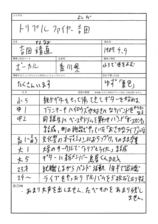 アーティストの音楽遍歴を紐解くことで、音楽を探求することの面白さや、アーティストの新たな魅力を浮き彫りにするこの企画。今回は2024年7月に約7年ぶりのアルバム「EXTRA」をリリースし好評を得たトリプルファイヤーのボーカリスト・吉田靖直の音楽遍歴に迫った。