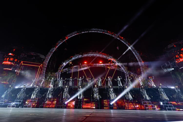 メンバーがステージを去ると、再び会場が暗転。すると、ステージセットやLEDスクリーンがまばゆい光を放ちながら、荘厳なSEにあわせてステージ中央に4周年を意味する「IV」の文字が表示される。続けて、重厚なリズムが鳴り始めると、真っ赤に染まった会場にメンバーのシンガロングが響き渡り、ステージ上にメンバーのシルエットが浮かび上がった。スタジアムが真っ赤に染まる中、「嵐の前、世界の終わり」に突入。メンバーは山下瞳月を中心に、力強くもしなやかなダンスで観る者を魅了し続ける。そのまま「何歳の頃に戻りたいのか?」へなだれ込むと、山崎天の「おいBuddies、お前らもっと声出せるだろ?」の煽りとともにギアが一段高く上がり、続く「BAN」で会場をこの日最初のクライマックスへと導いた。