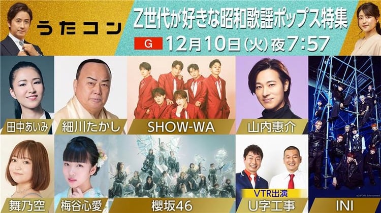 明日12月10日放送のNHK総合「うたコン」にINI、櫻坂46、梅谷心愛、田中あいみ、舞乃空、SHOW-WA、細川たかし、山内惠介が出演する。