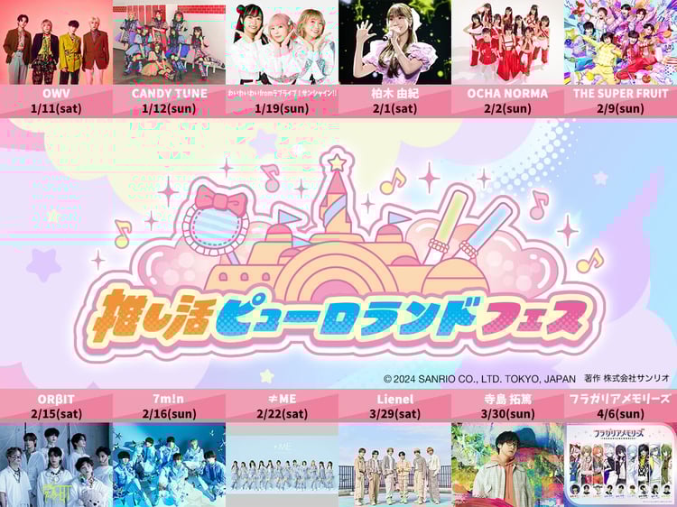 「推し活ピューロランドフェス」は“推し活ライフ”を応援するイベント。アーティストやアイドル、声優、タレント、アニメコンテンツなど、12組のさまざまなジャンルのアーティストのライブイベントが各日行われる。出演者にはOWV、CANDY TUNE、Lienel、わいわいわい from ラブライブ!サンシャイン!!、柏木由紀、OCHA NORMA、THE SUPER FRUIT、ORβIT、7m!n、寺島拓篤、フラガリアメモリーズ、≠MEがラインナップされた。当日はサンリオキャラクターによるコラボレーションライブやコラボグッズの販売も行われる。