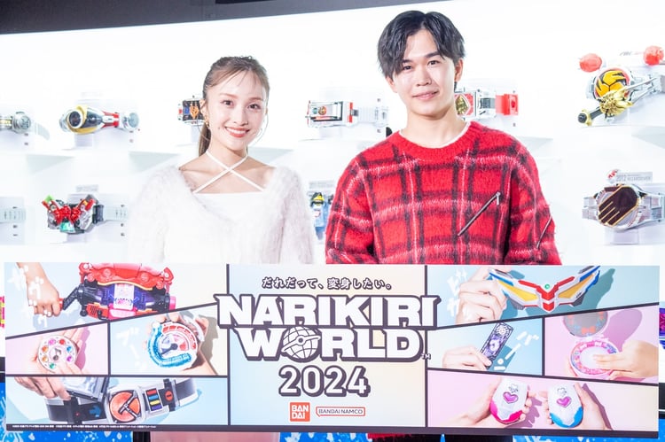「NARIKIRI WORLD」はキャラクターになりきって遊べるバンダイ「なりきり玩具」のリアルイベント。「だれだって、変身したい。」をテーマに200点以上のなりきり玩具が集められた。子供の頃から仮面ライダーファンで、「仮面ライダー俳優になる」という夢を叶えた鈴木と、子供の頃からアニメ「おジャ魔女どれみ」のファンである百田は100点以上の玩具が飾られたクリスマスツリーの点灯式に参加。さらにオープニングセレモニーでトークを行った。