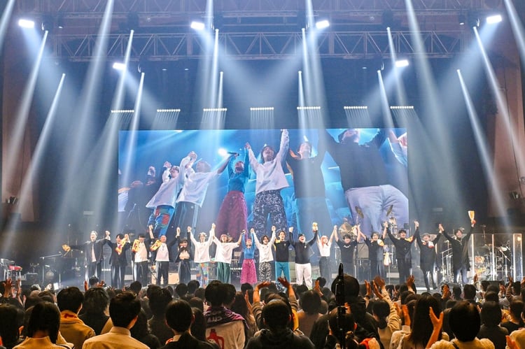 3階席まで満員の客席を見渡しながら、興奮を抑えきれない様子でパシフィコ横浜のステージに姿を現した6人。メンバーのほかにもゴスペルコーラス隊5人、コーラス隊2人、ホーン隊3人が後方に控えた大編成だ。ボーカルの浪岡真太郎(Vo, G)と大島真帆(Vo, Cho)は、演奏メンバーが刻むビートに合わせてオーディエンスのクラップを煽りながら「Live in This way」を歌い出し、その圧倒的なグルーヴ感で会場の熱気を一気に上昇させていく。