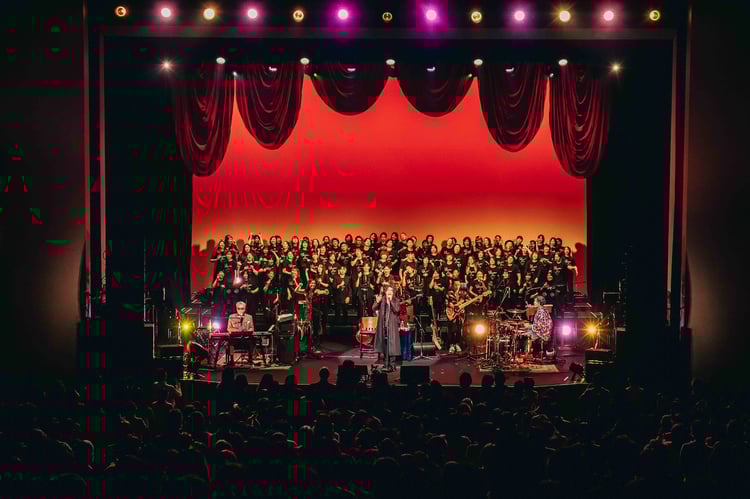 毎年クリスマスシーズンにワンマンライブを行っているSkoop On Somebody。今年は大阪、愛知、北海道、福岡、神奈川の5都市を巡り、冬ならではのステージを観客に届けた。ファイナルとなった横浜関内ホール公演にはオーディションで選ばれた80名のクワイアが参加し、迫力たっぷりのパフォーマンスが繰り広げられた。ライブは「ANSWER ~歓びの歌~ ALBUM ver.」で幕開け。15名のクワイアによるアカペラが美しいハーモニーを響かせ、厳かなムードが漂ったのも束の間、バンドと演奏に合わせステージ後方の幕が開くとさらに65名のクワイアが登場。続く「Save Our Smiles」では、ステージ上のクワイアだけでなく、観客1人ひとりが体を揺らして声を上げるなど、思い思いに楽曲を楽しんでいた。