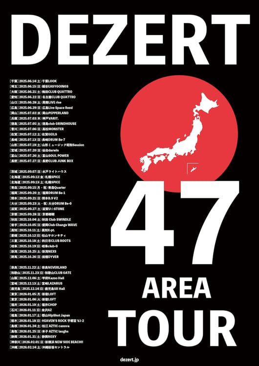本日12月27日にキャリア初の東京・日本武道館単独公演を完遂したDEZERTが、2025年から2026年にかけてのライブスケジュールを一挙に発表した。