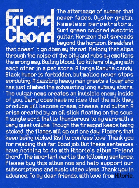 「Friend Chord」はヒトリエのメジャーデビュー10周年を記念してリリースされるアルバム。意味深な英文で埋め尽くされたジャケットのアートワークは、シングル「オン・ザ・フロントライン / センスレス・ワンダー[ReREC]」に続きグラフィックデザイナーの一ノ瀬雄太が手がけた。