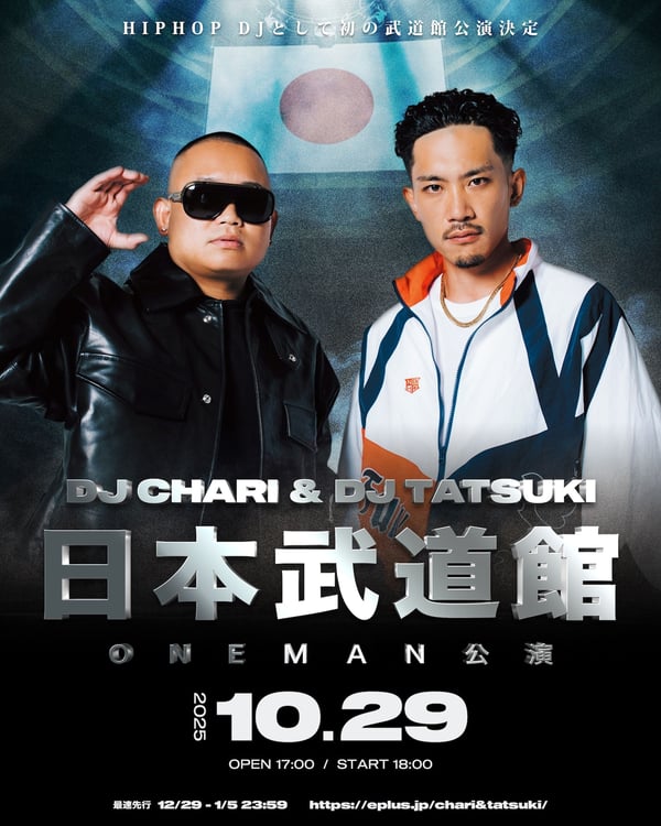 ヒップホップDJが日本武道館でワンマンライブを行うのはこれが初。DJ CHARI & DJ TATSUKIとともに楽曲を生み出してきた豪華アーティストがゲストとして出演予定で、イープラスではチケットの最速予約を1月5日まで先着で受け付けている。