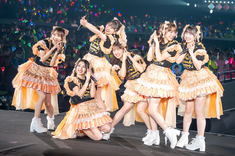 ライブ中盤には昨年4月のライブでさいたまスーパーアリーナ公演の開催決定が発表された瞬間の映像、メンバーがこの日までの歩みや宣伝部員への思いを語るインタビュー、そして4年前の無観客ライブで夢と決意を口にしたときの模様が上映される。映像の中で4年前の坂井が「次は必ずみんなでここに来ましょう。そんな思いを込めて『100%オレンジ』」と曲振りをすると、6人は当時のライブで着用したオレンジ衣装をアップデートした新衣装を身にまといステージへ。LEDビジョンに投影される過去の自分たちとリンクするように「100%オレンジ」を柔らかに歌い上げた。メンバーと宣伝部員が掲げるペンライトの光によって、さいたまスーパーアリーナはきれいなオレンジ一色に。場内に広がるドラマチックな景色と、「同じ笑顔のまま ここでまた会おうね」というこの瞬間のシチュエーションと重なる歌詞が感動を誘い、メンバーの頬にも涙が伝った。