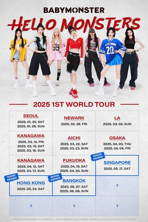 BABYMONSTERのワールドツアー「2025 BABYMONSTER 1st WORLD TOUR『HELLO MONSTERS』」にシンガポール、香港、バンコク公演が追加された。