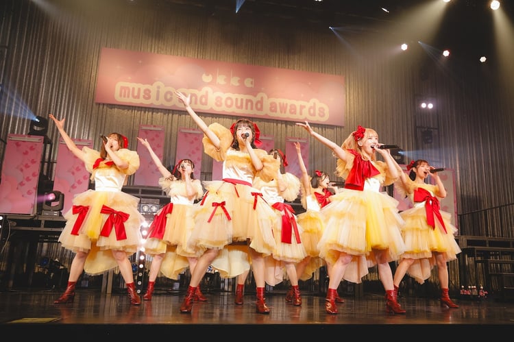 「ukka music and sound awards」は事前に実施した楽曲人気投票の結果をもとに、ランキング形式でパフォーマンスを披露していく“楽曲大賞ライブ”。今年で結成10周年を迎えるukkaのオリジナル曲のレパートリーは、桜エビ~ず名義で活動していた時期も合わせると63曲にのぼる。赤いリボンが目を引くキュートな衣装に身を包んだukkaは、リリース時期の関係で投票対象外となった「推≒恋」をオープニングで歌唱。そして20位にランクインした「ねぇ、ローファー。」を皮切りに、ランキングの上位曲を順に披露していく。インディーズ時代の楽曲も2022年のメジャーデビュー以降の楽曲も見事にバランスよくセットリストに入る中、ライブが進むにつれて場内の熱量が高まっていった。