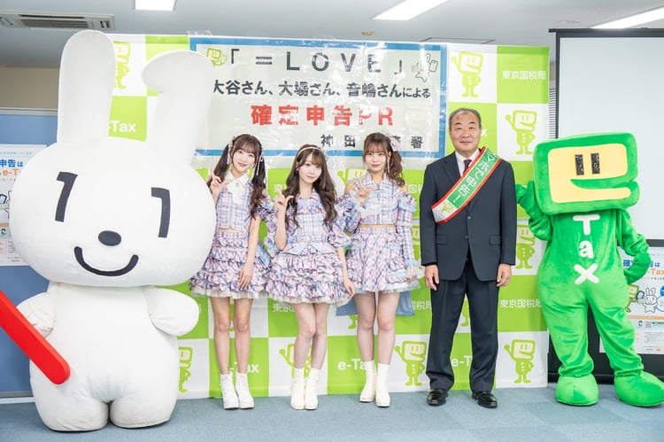 =LOVEの大谷映美里、大場花菜、音嶋莉沙が本日1月21日に東京・神田税務署で行われたe-TaxのPR会見に登壇した。