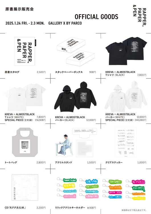 そのほか、グッズ売り場には「ラッパーと紙とペン」で販売される原書16点の記録をまとめたカタログやA4サイズの紙をストックするためのスタックペーパーボックス、キービジュアルのアウトテイクを使用したトートバッグ、KREVA初のアクリルスタンド、手書きリリックをデザインしたアクリルキーホルダーやクリアステッカーなども並ぶ。KREVAがこの展示会のために作った会場BGMを収録したCD「R.P.P.B.G.M」も販売され、家に帰ってからも「ラッパーと紙とペン」を楽しめるラインナップとなっている。
