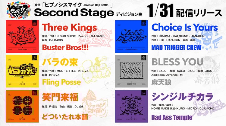 2月21日公開の映画「ヒプノシスマイク -Division Rap Battle-」の劇中で繰り広げられる「ファイナルディビジョン・ラップバトル」の“Second Stage”の詳細が明らかになった。