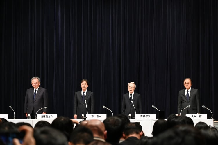 会見には株式会社フジ・メディア・ホールディングスおよび株式会社フジテレビジョン代表取締役会長の嘉納修治氏、株式会社フジテレビジョン取締役副会長の遠藤龍之介氏、株式会社フジテレビジョン代表取締役社長の港浩一氏、株式会社フジ・メディア・ホールディングス代表取締役社長の金光修氏の4名が登壇。会見冒頭に嘉納氏と港氏が本日1月27日でそれぞれの役職を辞任することを発表した。なお新社長にはフジ・メディア・ホールディングスの清水賢治専務取締役が就任する。