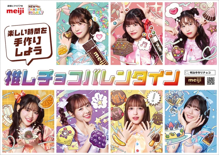 「明治おかし大使」を務めているFRUITS ZIPPERは、今回のCMで高校の仲良し7人組に扮した。FRUITS ZIPPERの人気曲「ハピチョコ」が流れる中、7人はバレンタインにお菓子を交換するために、おのおのの家でお菓子作りに挑戦。そしてお互いの気持ちがこもったお菓子を交換し、楽しさと友情に満ちたバレンタインを過ごす姿が描かれる。松本かれんは「私たちも明治の撮影でいっぱいお菓子作ったりしているんですけど、そういうFRUITS ZIPPERがお菓子を作っている動画とか、私たちのハピチョコとかいっぱい聴いて、可愛い気持ちで手作りしてほしいです!」とファンにメッセージを送った。