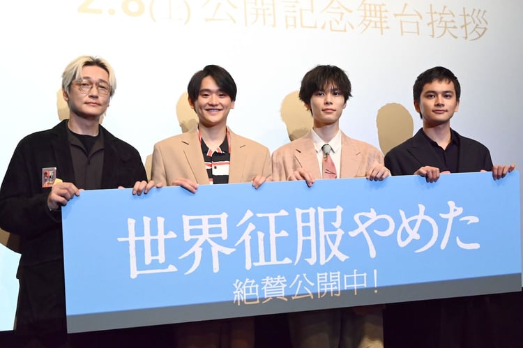 北村匠海(DISH//)が脚本・監督を務める映画「世界征服やめた」の公開記念舞台挨拶が本日2月7日に東京・ヒューマントラストシネマ渋谷で行われ、北村監督、主演の萩原利久と藤堂日向、井浦新が登壇した。