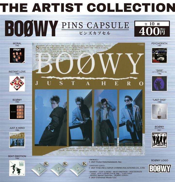 アーティストのアルバムジャケットやロゴをデザインしたピンズカプセルトイシリーズ「THE ARTIST COLLECTION」の第7弾として発売されるBOØWYのカプセルトイ。オリジナルアルバムのカバーデザイン、ライブアルバムのカバーデザイン、7inch BOXセットのカバーデザイン、ロゴデザインなど全10種類のピンバッジが専用台紙とともにカプセル内に収納される。