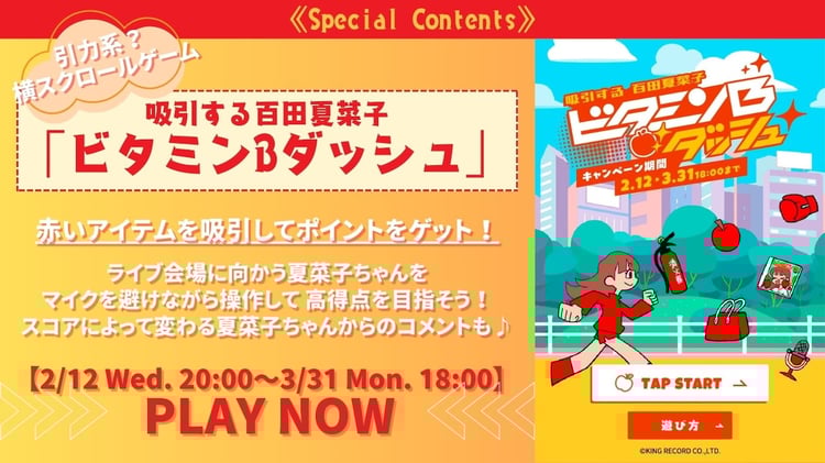 本日2月12日に百田夏菜子(ももいろクローバーZ)の1stソロアルバム「ビタミンB」がリリースされたことを記念し、「【吸引する 百田夏菜子 ビタミンBダッシュ】引力系?横スクロールゲーム」が特設サイトで公開された。
