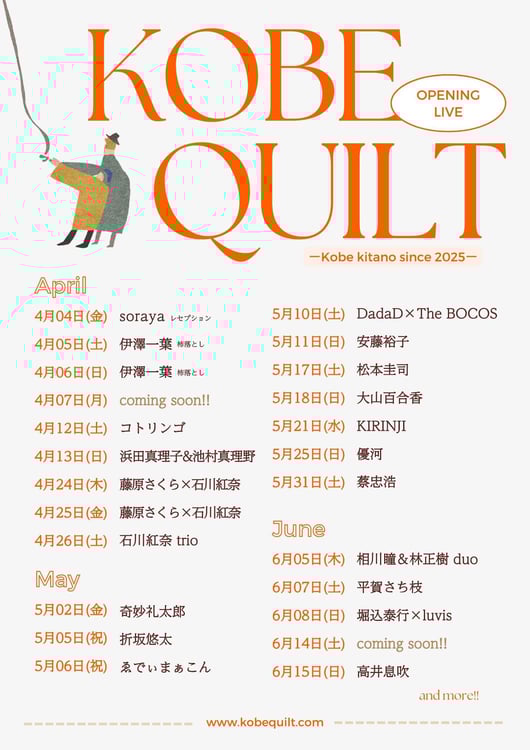 さらにKOBE QUILTの開店発表に合わせ、オープニングイベントの開催もアナウンスされた。まずオープン前日の4月4日にsorayaが出演する招待制イベントが行われ、初日の5日と6日には伊澤一葉(東京事変、the HIATUS)によるこけら落とし公演を実施。以降は6月までワンマンライブを中心にスケジュールが組まれ、コトリンゴ、藤原さくら×石川紅奈、奇妙礼太郎、折坂悠太、KIRINJI、優河、高井息吹らの出演が決まっている。