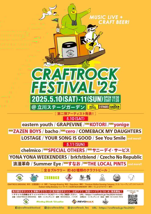 5月10日と11日に東京・立川ステージガーデンにて行われる音楽フェス「CRAFTROCK FESTIVAL '25」の出演アーティスト第2弾が発表された。