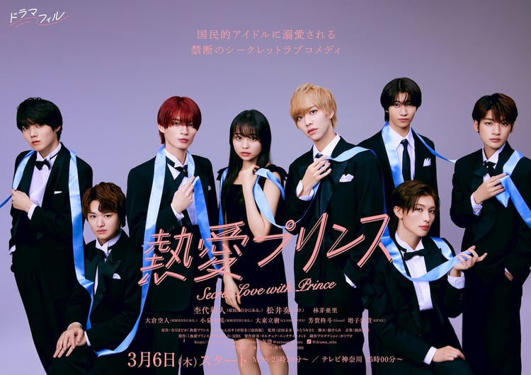 本日公開されたのは男性キャスト7人が黒いタキシード、林がブラックのワンピースを身にまとったポスタービジュアル。キャスト陣をつなぐ水色のリボンは8人の恋心を表現している。なお「熱愛プリンス」は3月6日よりMBS、テレビ神奈川ほかで順次放送される。