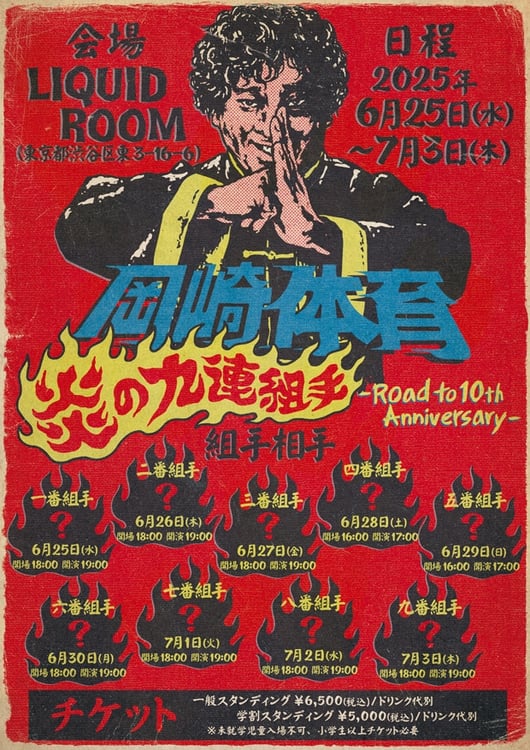 岡崎体育のツーマンイベント「炎の九連組み手 -Road to 10th Anniversary-」が6月25日から7月3日まで9日間連続で東京・LIQUIDROOMにて開催される。