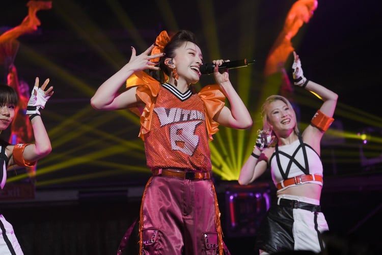 この「ビタミンB」というタイトルは、約10年前にももクロのレギュラー番組内で行われたクイズ企画にて、「にゅーとんが りんごで発見 ◯◯」という問題に対し、百田が「引力」ではなく「ビタミンB」と答えたシーンが由来。この珍回答がアルバムタイトルと曲名に昇華され、大勢の観客が集結するライブ空間で「B!B!ビタミンB!」と何度も連呼された。スモークの演出もあいまって会場のボルテージがぐんぐんと上昇していく中、間奏では百田が2人組のダンサーの“姉さんS”、つなぎを着た4人組ダンサー“4B”とともにお尻を振るキュートな振付を披露する場面も。続いて投下されたももクロのパンキッシュなナンバー「ダンシングタンク♡」では、自己紹介パートをこのツアー限りの特別な歌詞にアレンジ。百田は「かつてニュートンがリンゴで発見したビタミンB。お前らに足りてないのはビタミンBと太陽!」と高らかに叫び、大きな喝采を浴びた。
