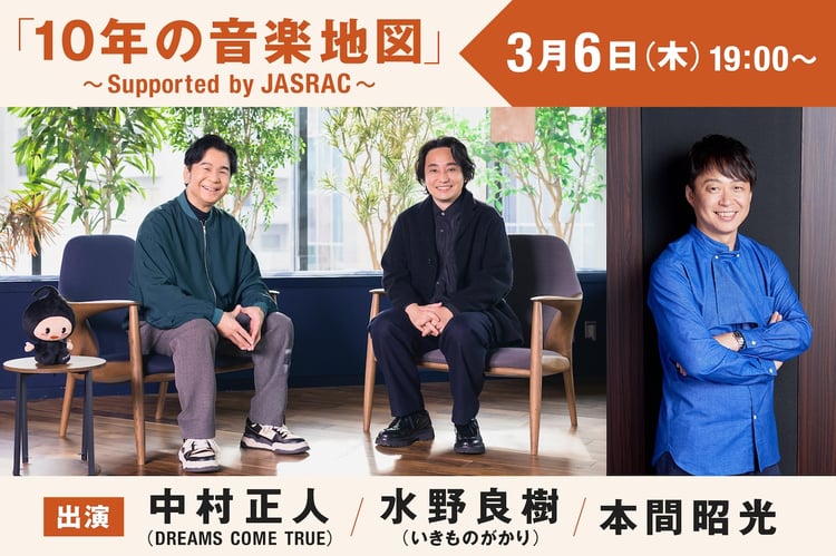 JASRACによるトークイベント「『10年の音楽地図』~Supported by JASRAC~」が明日3月6日19:00に開催される。本イベントの模様が音楽ナタリーのYouTubeチャンネルにて生配信されることが決定した。
