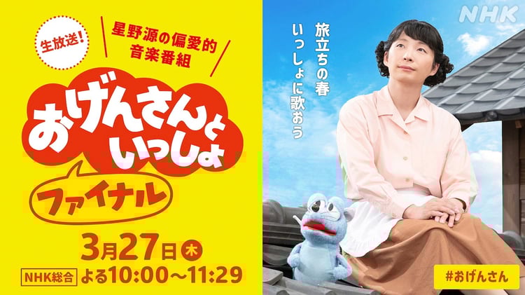 また本編終了後、番組の舞台裏を届ける「もうすぐ後夜祭」と題した生配信がNHK MUSICのYouTubeチャンネルで行われること、そして、これまでの「おげんさん」の名シーンを振り返る「後夜祭」がNHK BSで生放送されることも明らかになった。これにより、「おげんさん」最終回は3時間を超える“春のおげんさん祭り”となる。