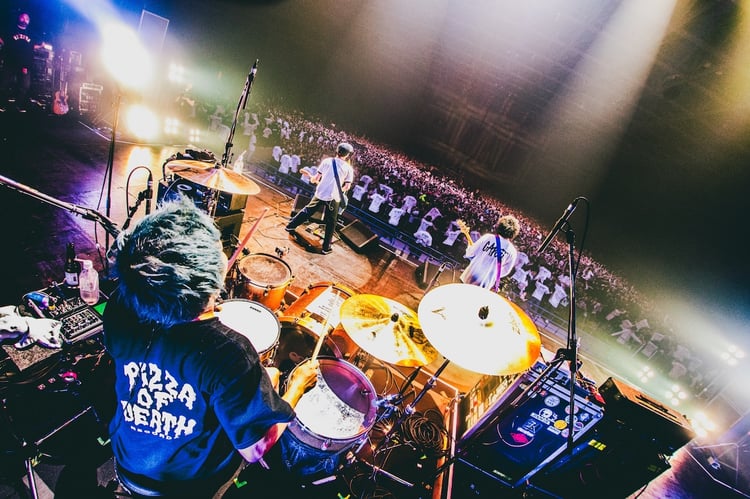 GIZAGIZA STAGEのトップバッターを務め、記念すべき「RUMBLE×JAG 2025」の1音目を鳴らしたのは、名古屋出身のスリーピースロックバンド・Maki。彼らは、新たな「RUMBLE×JAG 2025」の成功を願うように「朝焼け」を披露して力強くイベントの幕を開けると、山本響(Vo, Ba)いわく「研いで研いで研いで“ドッキンドッキン”になった鋭さと優しさ」を湛えた楽曲を次々と繰り出し、さっそく会場を大合唱と熱狂で満たした。