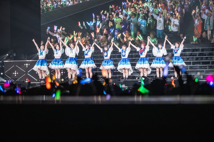 青いセーラー服風の衣装に着替え、9人は再びステージへ。安本と桜井の圧巻のアカペラで始まった「手をつなごう」では、メンバーの呼びかけに応えて大サビでファミリーも大合唱を繰り広げる。再びトロッコで会場を巡る9人を、ファミリーのサイリウムのカラフルな光が照らした「フレ!フレ!サイリウム」のあと、真山は「みんなが振ってくれるサイリウムが私たちの力になっています。1つひとつが特別で、星の光のように感じてます。みんなが照らしてくれる光に手が届きますように」と思いを語り、9人で「星の数え方」を丁寧に歌い上げた。続いて始まった「感情電車」では、ここまで光り続けていた9色のサイリウムに青色の光が多数加わり、ファミリーの思いをメンバーに届けるひとときに。この曲のクライマックスと言えるDメロのソロパートで、小林は1人花道へと飛び出し、伸びやかな歌声をアリーナに響かせる。そのあとを追うようにメンバー8人が花道を駆け、ステージ上にドラマチックな光景が広がった。