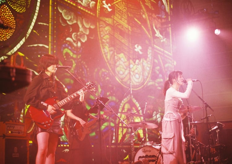 後半に差し掛かると、Homecomingsはプロデューサーに亀田誠治を迎えたオルタナティブナンバー「slowboat」や、楽曲全体を包む神秘的なムードとノイジなーギターが美しい調和を生む「angel near you」など、最新アルバムの楽曲を次々と届けてバンドの現在地を提示。そして福富による浮遊感漂うインストゥルメンタル「(all the bright places)」をインタールードに、温かな音色のミディアムナンバー「Tenderly, two line」をじっくりと届けた。この日のハイライトの1つになった「Air」には、ゲストボーカルとして塩塚が参加。ステージ後方の幕が開き煌びやかなステンドグラスが姿を見せる中、自然と体が動き出してしまいそうな心地よいダンスビートに、畳野と塩塚の穏やかな歌声を溶かして場内に幻想的な光景を作り上げた。Homecomingsはその後、「US / アス」「blue poetry」で再びフロアに熱狂の渦を巻き起こし、深い余韻を残してステージをあとにした。