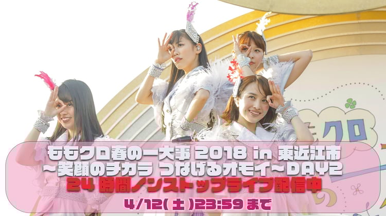 ももいろクローバーZが2018年4月に行ったライブ「ももクロ春の一大事2018 in 東近江市~笑顔のチカラ つなげるオモイ~」DAY2の模様が、YouTubeで本日4月1日20:00から12日23:59までライブ配信されている。