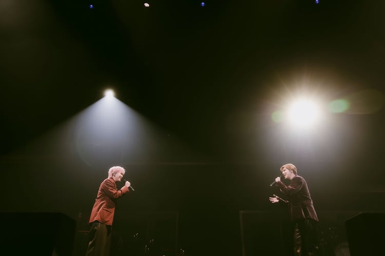 「普段の超特急のライブとは違うテイストでお届けするので、思う存分楽しんでいってください」。タカシがそう誘うと、2人は「refrain」でパフォーマンスを再開させる。優しくスウィングするメロパートから美しいハーモニーが大きな広がりを感じさせるサビパートへ。2人のボーカルと巧みなバンドアンサンブルが織りなす心地よい緩急に聴衆が聴き入ると、続く「Thinking of You」では2人の凛とふくよかなファルセットボイスに乗せて届けられる楽曲の温かなメッセージがオーディエンスの胸を打った。この2曲は2024年の「せぶいれのうた」でも披露された楽曲ながら、アレンジと2人の多彩な表現力によって1年前とはまた異なる表情をのぞかせる。アーバンスタイリッシュなサウンドが印象的な「You Don't Care」で断ち切れない思いを歌にするタカシはまっすぐ前を見据えながら大きな手振りでもあふれる思いを表現し、シューヤは時折目を閉じて内省的に感情を引き出していく。それぞれの表現を持ちながらも重なる2声は美しく溶け合い、静かに聴き入るオーディエンスの心を確かに震わせていた。