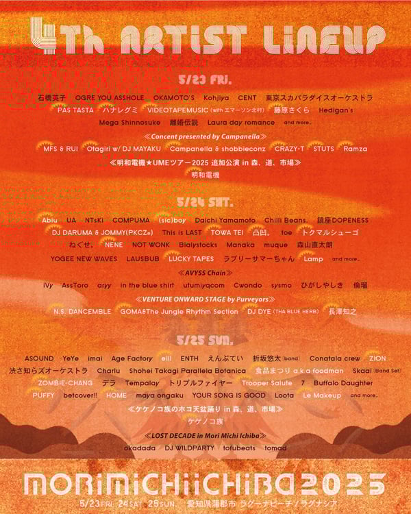 5月23日から25日までの3日間に愛知・蒲郡ラグーナビーチとラグナシアで開催される野外イベント「森、道、市場2025」の出演アーティスト第4弾が発表された。