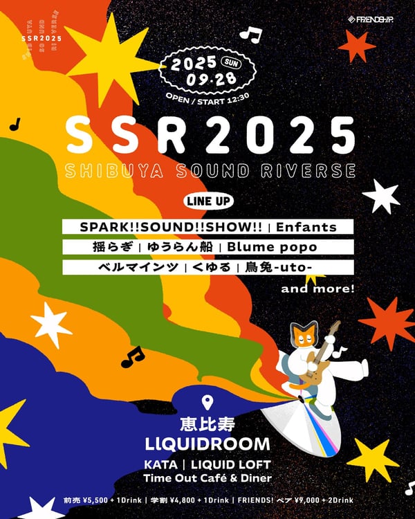 ライブイベント「【SSR2025】SHIBUYA SOUND RIVERSE」が9月28日に東京・LIQUIDROOM、KATA、LIQUID LOFT、Time Out Cafe & Dinerで開催される。