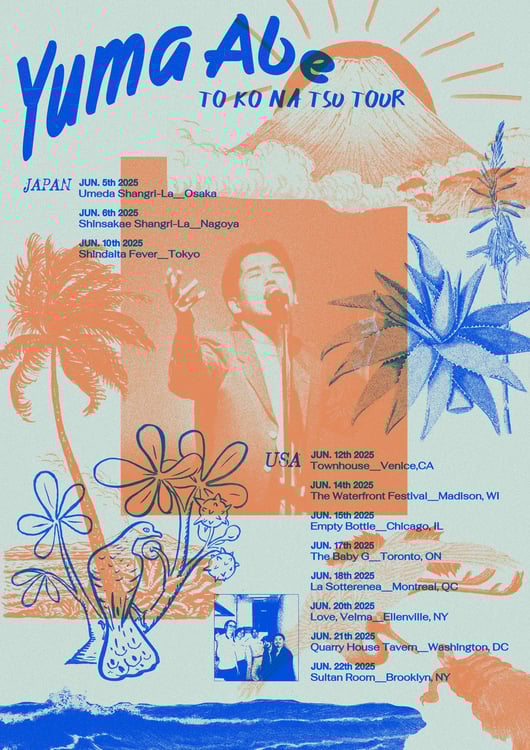 昨年11月に2ndソロアルバム「Hotel New Yuma」を発表し、アメリカとカナダ、日本を巡る全10公演のツアーを行った安部。今回の「TO KO NA TSU TOUR」は、前半の3公演が日本、残る8公演がアメリカとカナダで開催される。