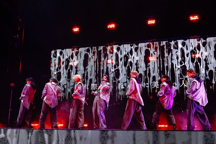 リーダー・吉澤による「僕らからの愛を受け取ってください」という宣言とともに届けられた、.ENDRECHERI.提供によるファンクナンバー「LLL」で7人の立つステージがダンスフロアに変貌してからは、「Foxy Grape」「In the Nude」とジャジーな雰囲気をまとう2曲を続け、スタイリッシュな振る舞いで観測者を魅了していったげんじぶ。「In the Nude」のパフォーマンスをステージに上がったライブカメラが追う映像演出は、彼らが2020年8月に行った配信ライブの演出のオマージュのようにも受け止められるもので、涼やかにスーツを翻しフィンガースナップを決める7人に注がれる観測者の視線も、曲を重ねるごとに熱いものになっていく。再び紗幕が引かれたステージで披露された「灼けゆく青」では、スクリーンに投影されたリリックが雨のように降り注ぎ、ひんやりと色のない声色でポエトリーリーディングをし、無機質な表情でステージ上を行き交う7人の巧みな表現を際立たせていた。