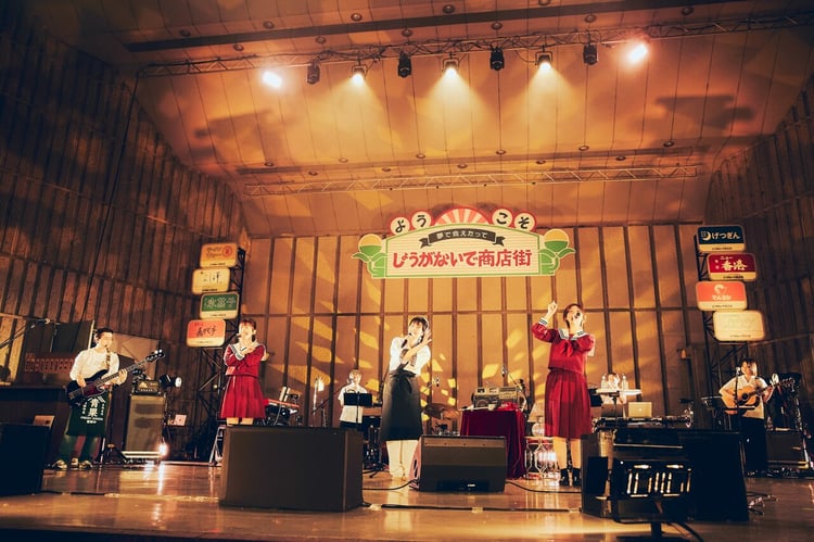 この日の野音は、昭和の香り漂う架空の商店街「夢で会えたってしょうがないで商店街」と化しており、ステージ上には「すなっく嘉代子」「パーラー氷菓子」「雀荘 ニュー香港」「エステサロン ケケケ」などのネオンが並ぶ。開演前の場内には「ご通行中の皆様、『夢で会えたってしょうがないで商店街』へようこそ」と郷愁を誘うアクセントのアナウンスが流れ、「このあと、あの伝説の寿司屋『鮨 よし澤』がいよいよオープンします! どうぞご期待ください!」というアナウンスののち、ステージ下手に設置された寿司屋のカウンターには、吉澤のライブにたびたび登場する愛犬・ウィンディ(人形操演・山田はるか)の姿が。「あがり一丁、あいよっ!」と「鮨 よし澤」の看板犬として張り切るウィンディは、“開店祝い”にやってきた3000人の観客に向けて、この寿司屋の名物である生演奏を担当するバンドメンバーを呼び込む。